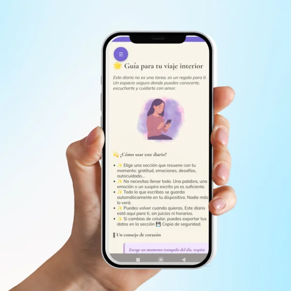Un diario digital diseñado para acompañarte en tu camino emocional, con secciones guiadas para reflexionar, agradecer, organizarte y reconectar con tu sabiduría interna.